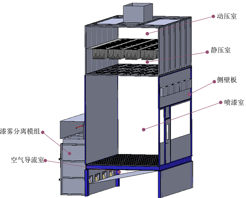 空氣及其攜帶的漆霧在空氣導(dǎo)流通道的引導(dǎo)下,由空氣導(dǎo)流室的下部流出,進(jìn)入抽屜式漆霧分離模組。空氣攜帶著漆霧右下而上經(jīng)過抽屜式漆霧分離模組的過程中,漆霧被布置于分離模組中的漆霧分離部件分離。
